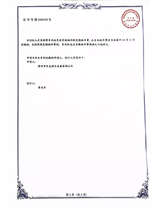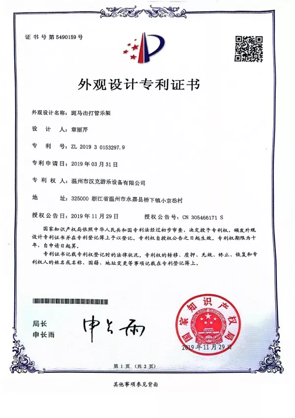 У исто време, као власнички производ компаније Ханк, пријавили смо се за сертификат о патенту дизајна за штанд за удараљке у облику зебра 2019. године и добили одобрење од Кинеског завода за интелектуалну својину.
